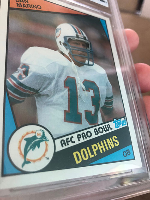 A few weeks ago I picked up a BGS 7.5 NM+ graded 1984 Topps Dan Marino Rookie card on eBay. I went with a 7.5 because I didn’t have a extra $1k+ to throw down on a PSA 10 version of the card (maybe someday). I noticed in the auction photos that the team bag the card was in looked a little rough but I figured that the slab itself would be fine. I was wrong.